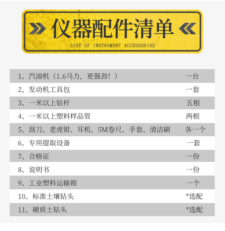 汽油动力发动机一台,发动机工具包一套,标准土壤钻头、硬质土钻头随意选配,不小于1米的钻杆5根、不小于1米的塑料样品管2根,刮刀、老虎钳、耳机、5M卷尺、手套、清洁刷各1个,专用提取设备1套、工业塑料运输箱1个
